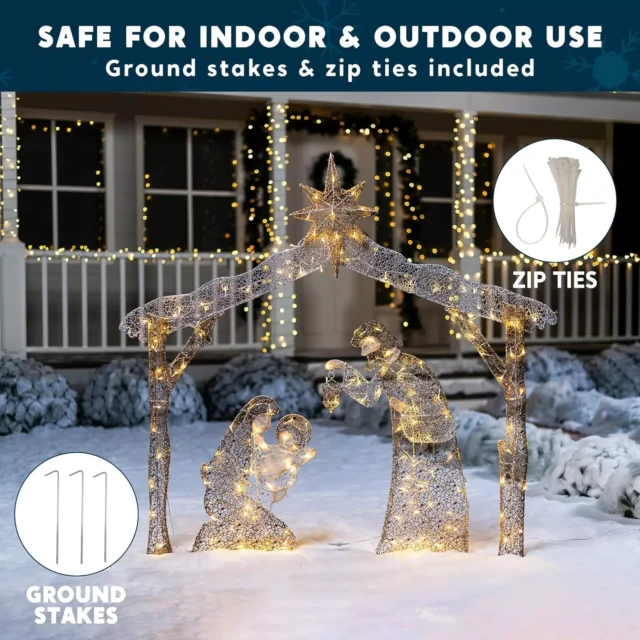 Create a warm, heartfelt holiday atmosphere with this beautiful 5 ft pre-lit nativity scene yard light. Designed to glow softly with 160 warm white LED lights, this display captures the peaceful moment of Joseph, Mary, and Baby Jesus in a way that feels magical and inviting. Whether placed in your yard, garden, porch, or indoor space, it becomes a stunning centerpiece that celebrates the essence of Christmas.