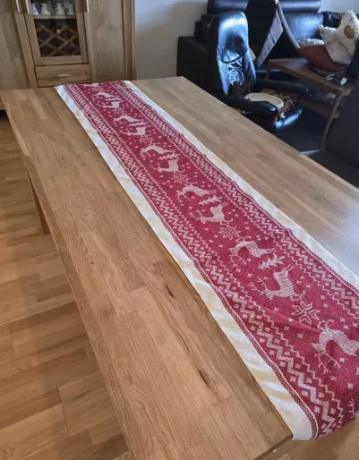 I was initially skeptical about purchasing a table runner online, but I am so glad I took the plunge with this one. The elk design is beautifully crafted and adds a touch of Christmas spirit to our dining room without being overly flashy or kitschy. It's well-made and durable, which is always a plus when you have kids running around during the holidays! Not only does it look great on our dining table, but it also works perfectly as a decorative piece on our console table in the foyer.