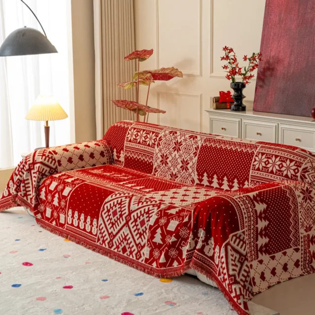 This festive red sofa cover and decorative blanket is more than just a seasonal accessory. It’s a cozy companion for your relaxing moments, a stylish addition to your holiday decor, and a practical solution for protecting your furniture.