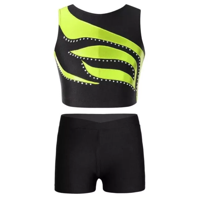 Introducing our stunning Girls Dance & Gymnastics Outfit, designed to add sparkle and comfort to your child’s performance. This exquisite set, featuring a sleeveless shiny rhinestone crop top paired with stylish shorts, is perfect for the aspiring dancer and gymnast. Its eye-catching design not only looks fabulous but also enhances performance, allowing your little star to shine brighter.