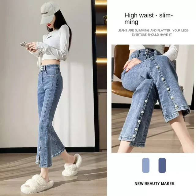 High Waist Pearl Jeans – Women’s Flare Denim with Chic Slits