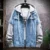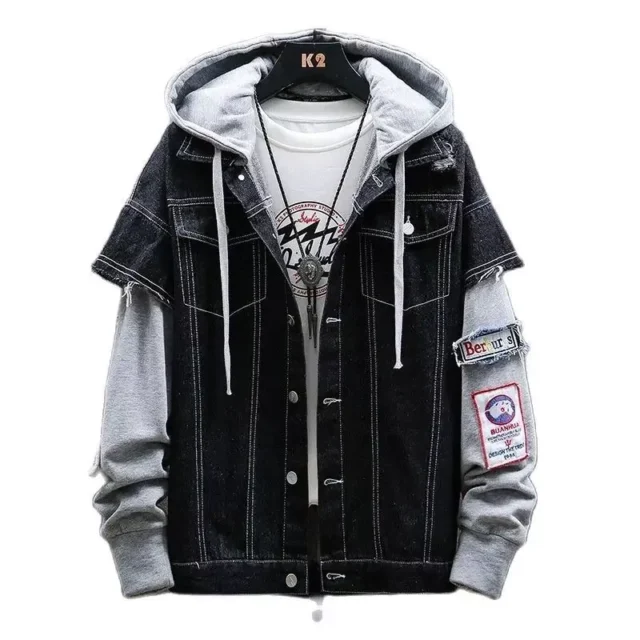 Our Men’s Hooded Denim Jacket stands out with its hip hop-inspired appliques, offering a personalized touch that makes each piece unique. The ingenious combination of denim and knit sleeves not only sets it apart in design but also in comfort, providing a snug fit that’s just right for the transitional weather of spring and autumn.