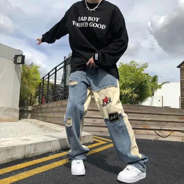 These jeans are a sartorial staple, crafted with care from quality cotton material that stands up to the rigors of daily wear while offering unmatched comfort. Suitable for all seasons and designed to fit into any casual scene, from street corners to the club, they are as versatile as they are stylish. With a mid-waist and straight, wide-leg cut, they bring the essence of hip-hop fashion to your everyday look.
