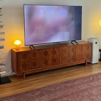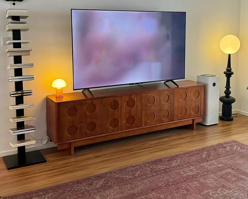 This elegantly designed television console, reminiscent of classic Nordic furniture, has been a delightful addition to my home. Its understated design, featuring clean lines and a warm wood finish, captures the essence of Scandinavian minimalism and retro charm. The quality of the material is immediately apparent, lending both durability and a touch of sophistication to my living space. What impresses me most is the thoughtful design that marries form and function; it accommodates all my media components without compromising on style. The storage options are ample and versatile, with spaces for displaying books and art, alongside hidden areas for less aesthetic but necessary items like cables and controllers. The console's proportions are just right, offering a substantial surface for my television while maintaining a light and airy feel that doesn’t overwhelm the room. Its construction is solid, giving me confidence in its longevity and resilience. The assembly was manageable and rewarding, with each piece fitting perfectly and contributing to a sense of accomplishment once completed. Beyond its practicality, the console has become a focal point in my room, drawing attention with its elegant lines and authentic design. It's a product that reflects a keen attention to detail and an understanding of the aesthetic and functional needs of contemporary living. This console is more than just a TV stand; it's a piece of art that enhances the overall ambiance of my living space, providing a perfect balance between modern functionality and nostalgic design